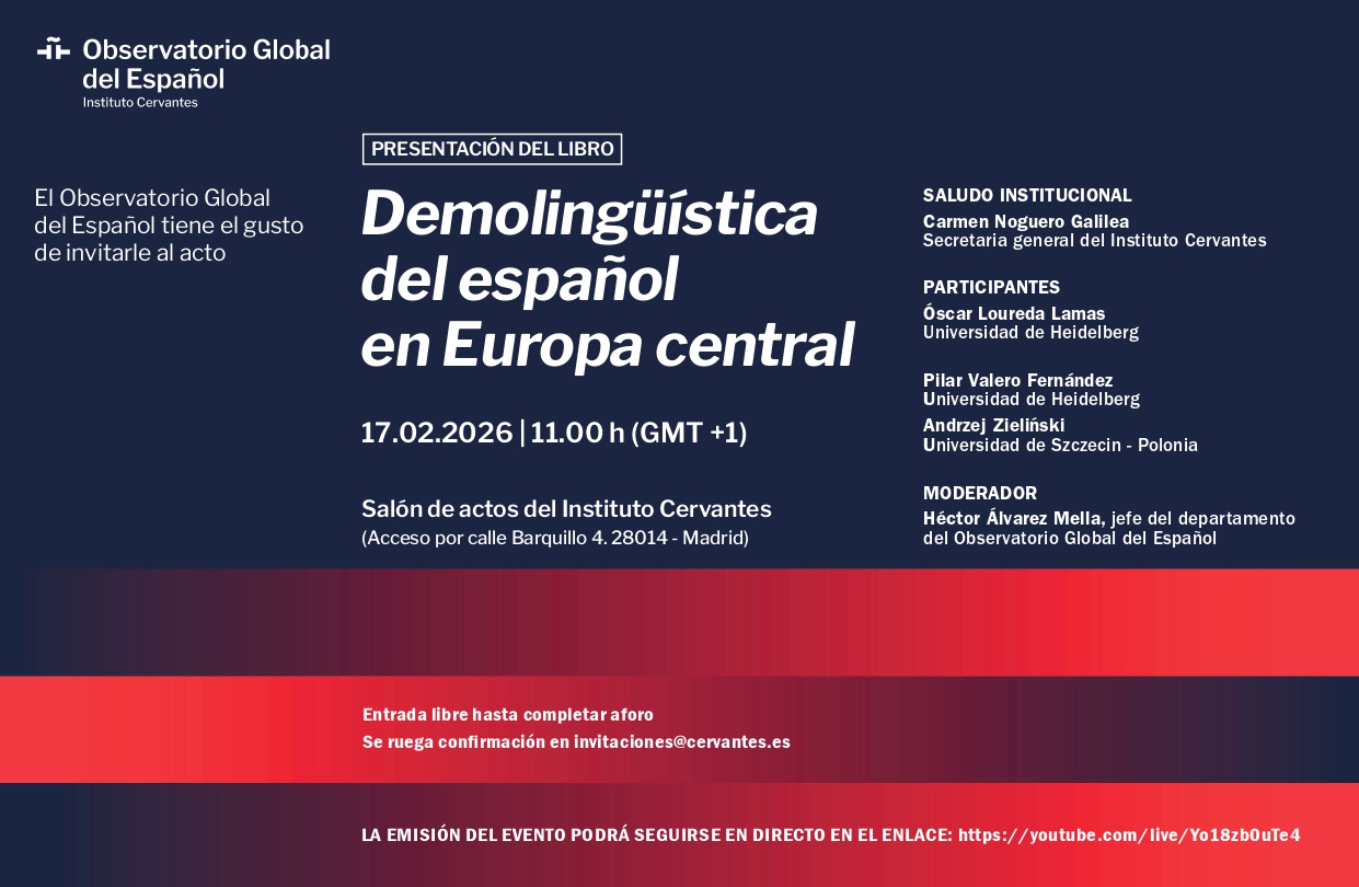 Presentará el acto la secretaria general del Instituto Cervantes, Carmen Noguero Galilea, y participarán en el coloquio posterior Óscar Loureda Lamas (Universidad de Heidelberg), Pilar Valero Fernández (Universidad de Heidelberg) y Andrzej Zieliński (Universidad de Szczecin), tres de los autores del libro. Moderará Héctor Álvarez Mella, jefe de departamento del Observatorio Global del Español y uno de los codirectores de la publicación.