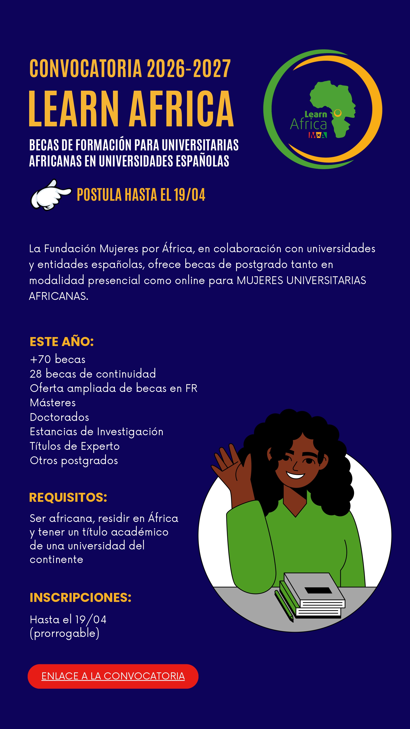 La Fundación Mujeres por África, en colaboración con universidades y entidades españolas, ofrece becas de postgrado tanto en modalidad presencial como online para mujeres universitarias africanas.
